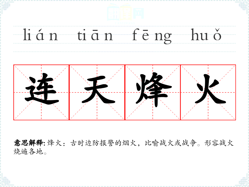 烽火:古时边防报警的烟火,比喻战火或战争。形容战火烧遍各地。