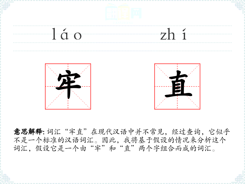 词汇“牢直”在现代汉语中并不常见,经过查询,它似乎不是一个标准的汉语词汇。因此,我将基于假设的情况来分析这个词汇,假设它是一个由“牢”和“直”两个字组合而成的词汇。