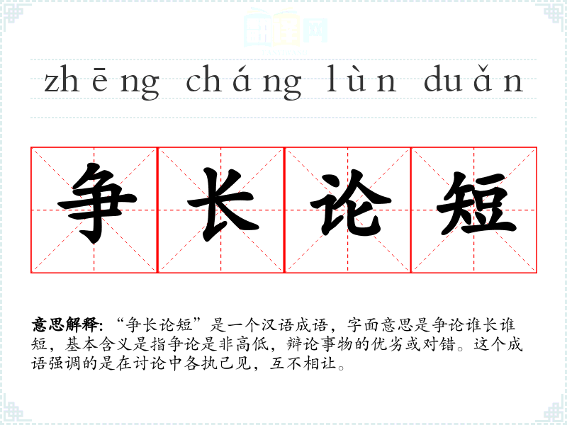 “争长论短”是一个汉语成语,字面意思是争论谁长谁短,基本含义是指争论是非高低,辩论事物的优劣或对错。这个成语强调的是在讨论中各执己见,互不相让。
