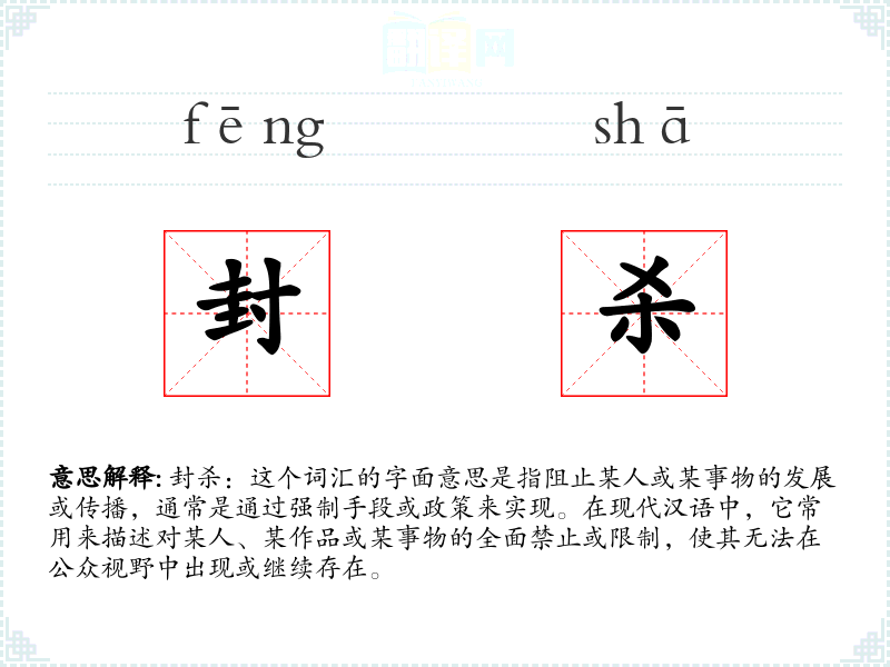 封杀:这个词汇的字面意思是指阻止某人或某事物的发展或传播,通常是通过强制手段或政策来实现。在现代汉语中,它常用来描述对某人、某作品或某事物的全面禁止或限制,使其无法在公众视野中出现或继续存在。