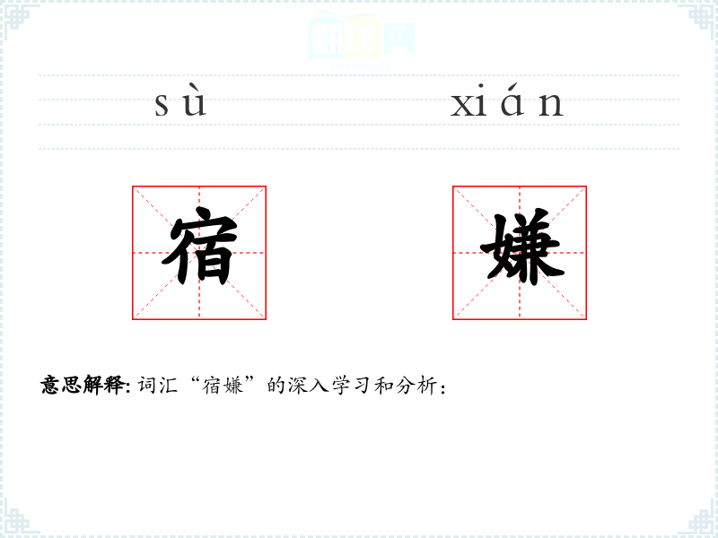 “宿嫌”字面意思是指长期积累的怨恨或不满。它由“宿”(意为长久、旧有的)和“嫌”(意为不满、怨恨)组成,合起来表示一种长期存在的、不易消除的怨恨或不满情绪。