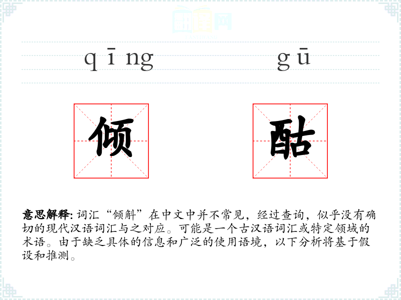 词汇“倾斛”在中文中并不常见,经过查询,似乎没有确切的现代汉语词汇与之对应。可能是一个古汉语词汇或特定领域的术语。由于缺乏具体的信息和广泛的使用语境,以下分析将基于假设和推测。