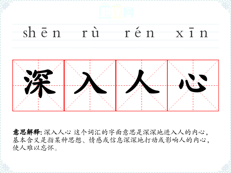 深入人心 这个词汇的字面意思是深深地进入人的内心,基本含义是指某种思想、情感或信息深深地打动或影响人的内心,使人难以忘怀。