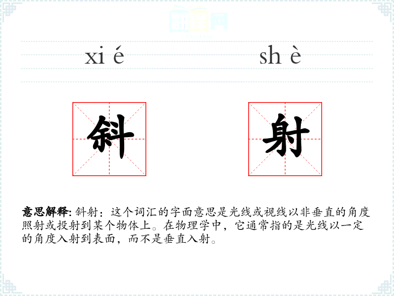 斜射:这个词汇的字面意思是光线或视线以非垂直的角度照射或投射到某个物体上。在物理学中,它通常指的是光线以一定的角度入射到表面,而不是垂直入射。