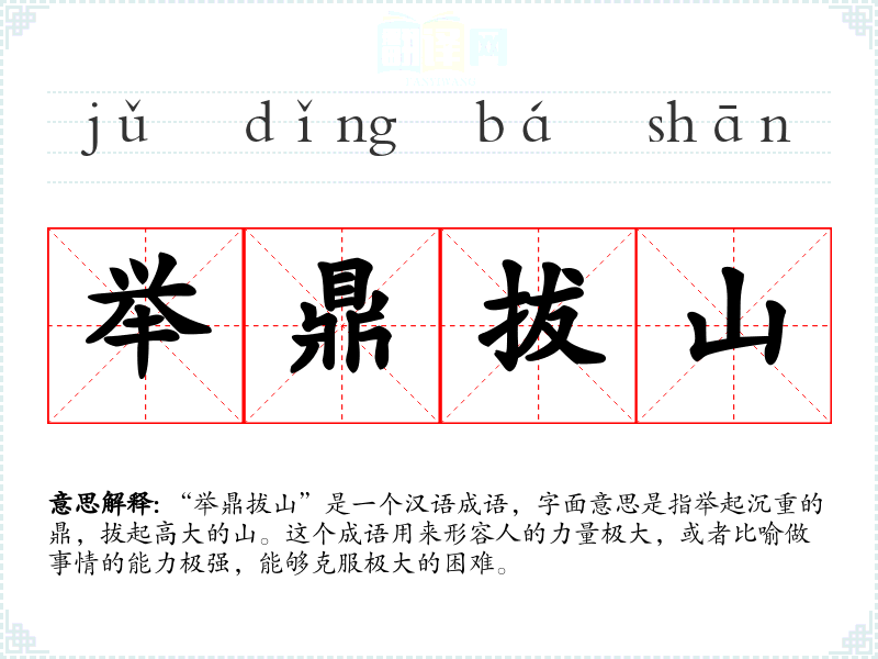“举鼎拔山”是一个汉语成语,字面意思是指举起沉重的鼎,拔起高大的山。这个成语用来形容人的力量极大,或者比喻做事情的能力极强,能够克服极大的困难。