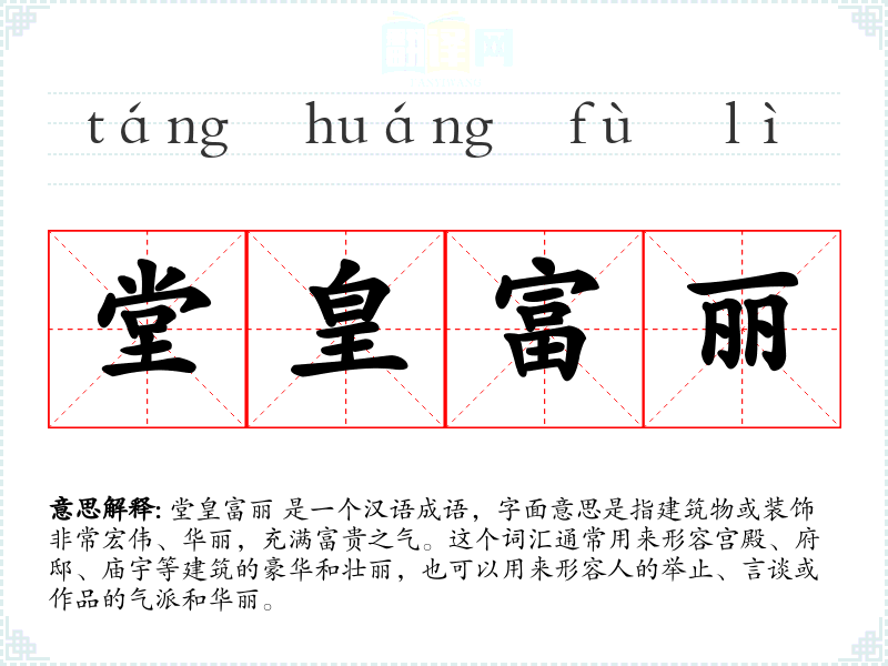 堂皇富丽 是一个汉语成语,字面意思是指建筑物或装饰非常宏伟、华丽,充满富贵之气。这个词汇通常用来形容宫殿、府邸、庙宇等建筑的豪华和壮丽,也可以用来形容人的举止、言谈或作品的气派和华丽。