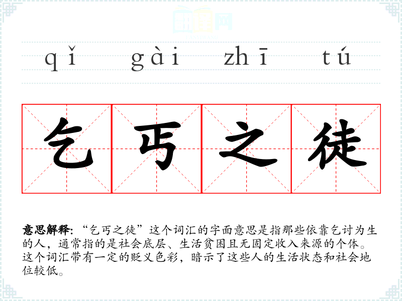 “乞丐之徒”这个词汇的字面意思是指那些依靠乞讨为生的人,通常指的是社会底层、生活贫困且无固定收入来源的个体。这个词汇带有一定的贬义色彩,暗示了这些人的生活状态和社会地位较低。