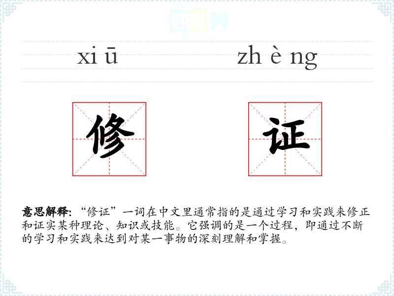 “修证”一词在中文里通常指的是通过学和实践来修正和证实某种理论、知识或技能。它强调的是一个过程,即通过不断的学和实践来达到对某一事物的深刻理解和掌握。