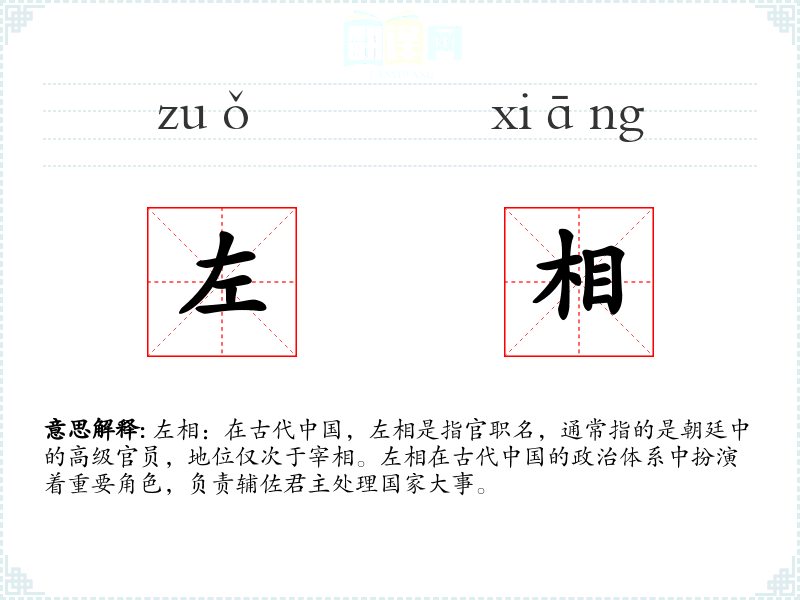 理解:左相作为古代的高级官员,代表了智慧和权力,是研究古代政治体系的重要词汇。 重要性*:在学和理解**古代历史和文化时,左相这一词汇提供了对古代政治结构和官职体系的深入认识。