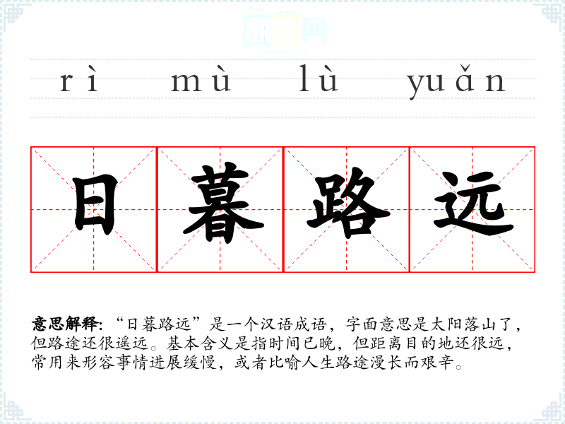 “日暮路远”是一个汉语成语,字面意思是太阳落山了,但路途还很遥远。基本含义是指时间已晚,但距离目的地还很远,常用来形容事情进展缓慢,或者比喻人生路途漫长而艰辛。