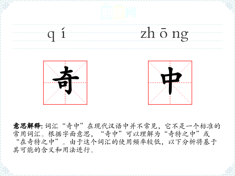 词汇“奇中”在现代汉语中并不常见,它不是一个标准的常用词汇。根据字面意思,“奇中”可以理解为“奇特之中”或“在奇特之中”。由于这个词汇的使用频率较低,以下分析将基于其可能的含义和用法进行。