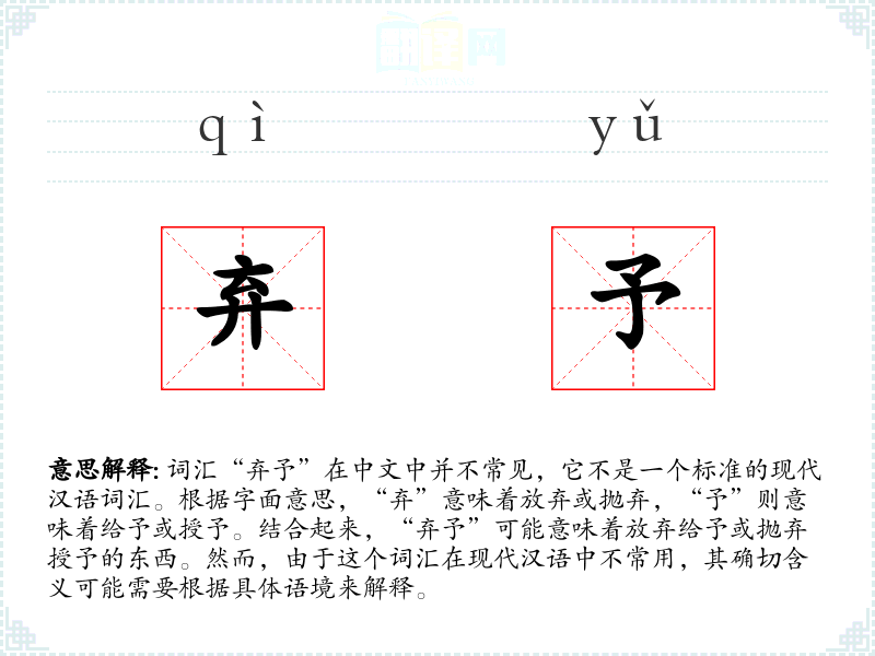 “弃予”作为一个不常用的词汇,其含义和用法需要根据具体语境来解释。在语言学习和表达中,了解这样的词汇可以帮助更深入地理解语言的丰富性和复杂性。然而,由于其不常用,实际应用可能有限。