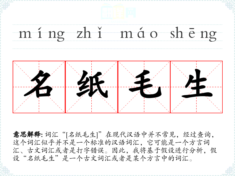 词汇“[名纸毛生]”在现代汉语中并不常见,经过查询,这个词汇似乎并不是一个标准的汉语词汇,它可能是一个方言词汇、古文词汇或者是打字错误。因此,我将基于假设进行分析,假设“名纸毛生”是一个古文词汇或者是某个方言中的词汇。