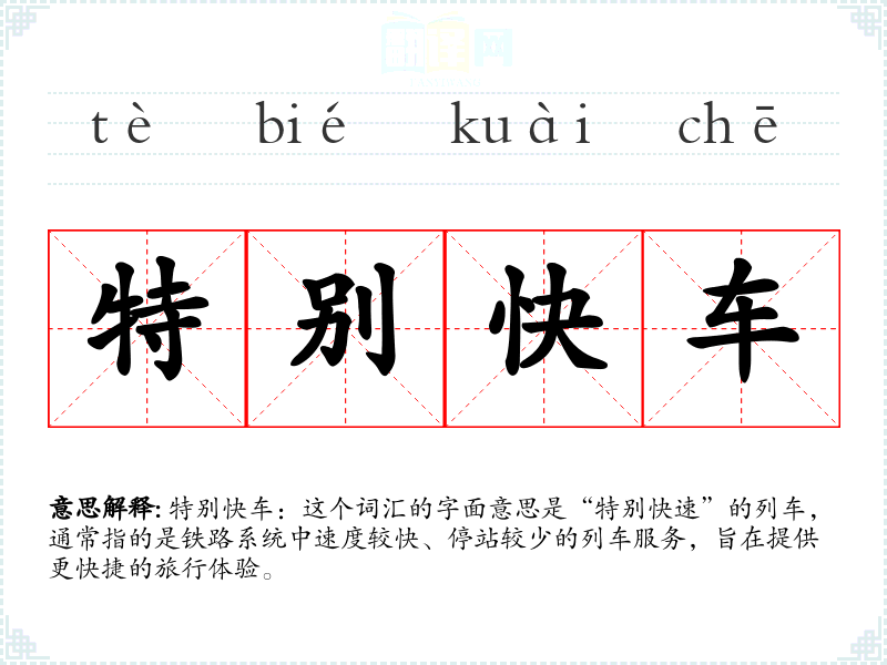 特别快车:这个词汇的字面意思是“特别快速”的列车,通常指的是铁路系统中速度较快、停站较少的列车服务,旨在提供更快捷的旅行体验。