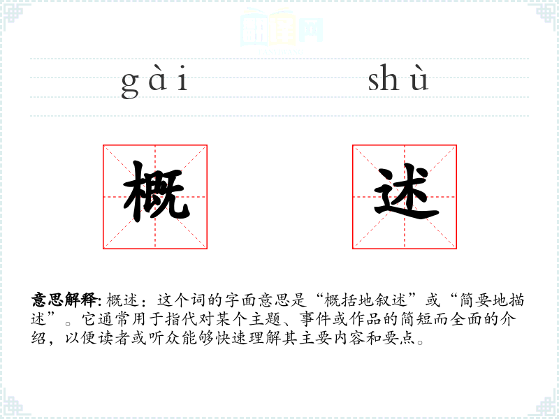 概述一词源自汉语,由“概”和“述”两个字组成。“概”意为概括、大致,“述”意为叙述、讲述。在古代文献中,这个词就已经被用来表示简要的叙述或说明。