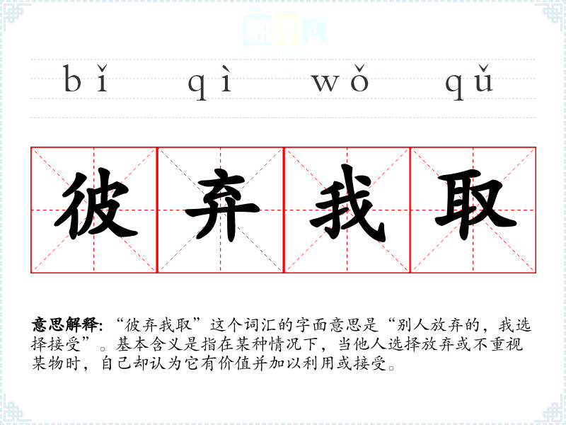 “彼弃我取”这个词汇的字面意思是“别人放弃的,我选择接受”。基本含义是指在某种情况下,当他人选择放弃或不重视某物时,自己却认为它有价值并加以利用或接受。