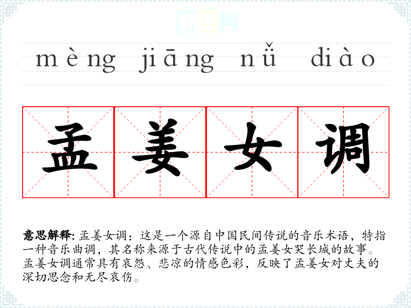 孟姜女调:这是一个源自**民间传说的音乐术语,特指一种音乐曲调,其名称来源于古代传说中的孟姜女哭长城的故事。孟姜女调通常具有哀怨、悲凉的情感色彩,反映了孟姜女对丈夫的深切思念和无尽哀伤。