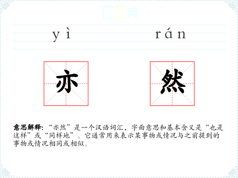 “亦然”是一个汉语词汇,字面意思和基本含义是“也是这样”或“同样地”。它通常用来表示某事物或情况与之前提到的事物或情况相同或相似。