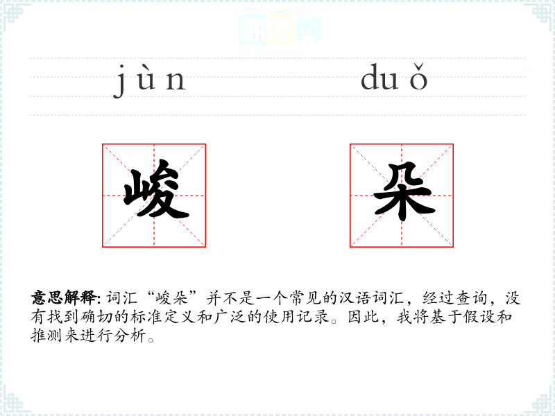 词汇“峻朵”并不是一个常见的汉语词汇,经过查询,没有找到确切的标准定义和广泛的使用记录。因此,我将基于假设和推测来进行分析。