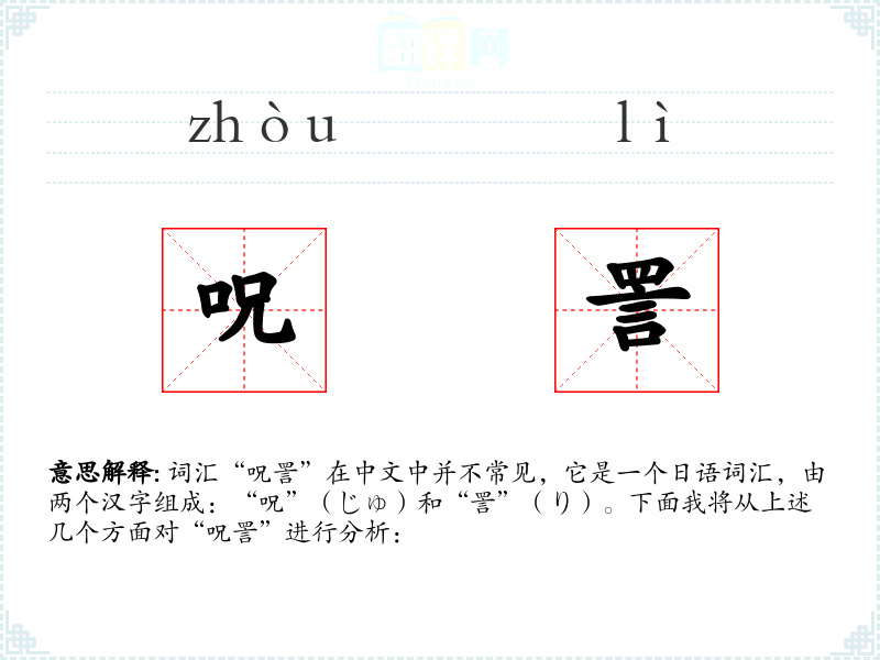 “呪詈”在日语中的字面意思是“诅咒”和“谩骂”。其中,“呪”指的是通过言语或仪式施加的诅咒,而“詈”则是指用言语进行侮辱或谩骂。