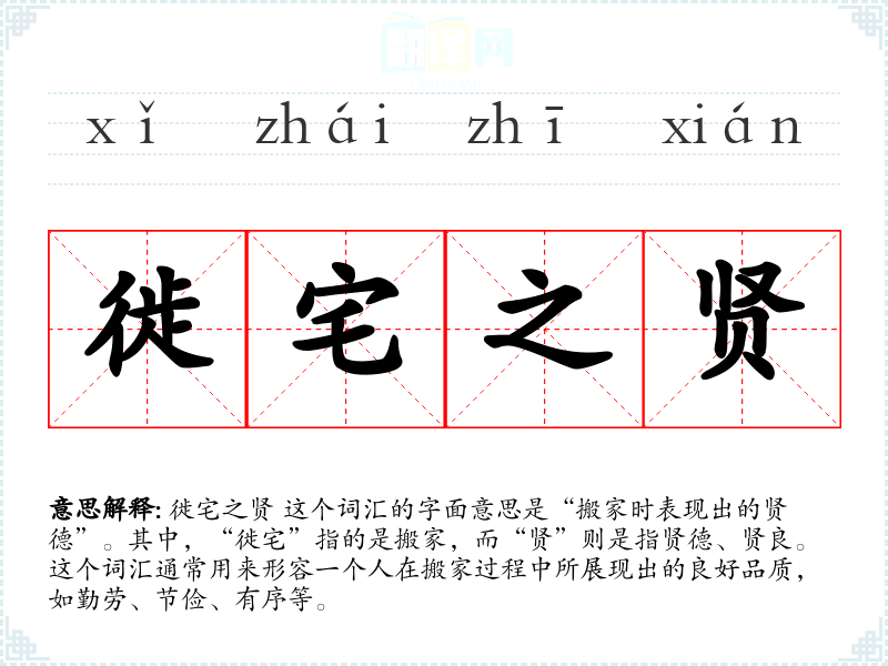在传统文化中,搬家被认为是一个重要的生活,涉及到家庭的稳定和幸福。因此,徙宅之贤 这个词汇体现了对家庭和谐和社会秩序的重视。