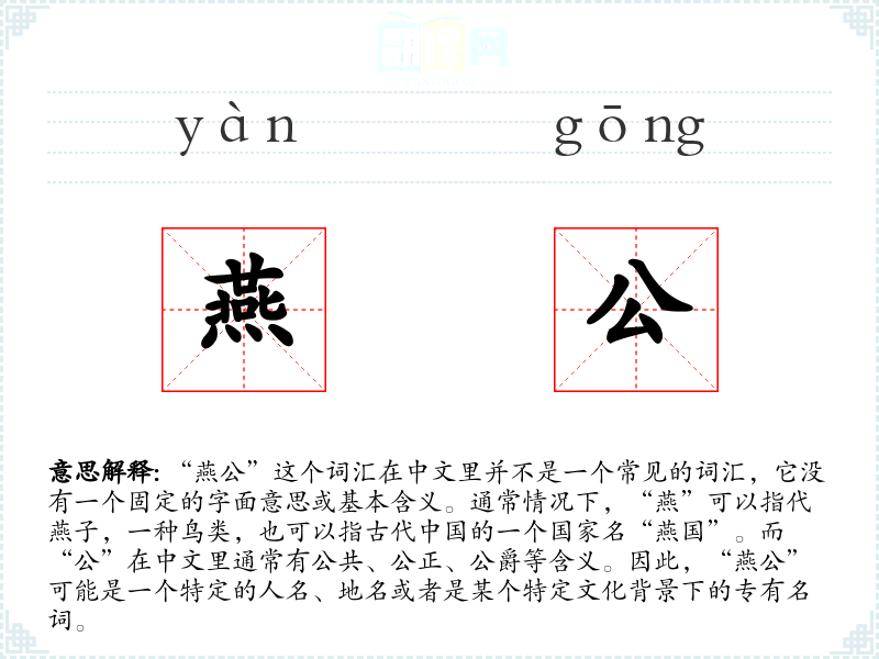 “燕公”这个词汇在中文中并不常见,它的使用和意义可能非常特定,需要结合具体的文化和历史背景来理解。在学*语言和表达中,了解这样的特定词汇可以帮助我们更好地理解中文的文化和历史。