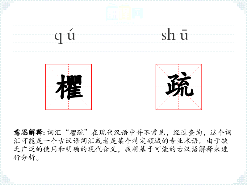 词汇“欋疏”在现代汉语中并不常见,经过查询,这个词汇可能是一个古汉语词汇或者是某个特定领域的专业术语。由于缺乏广泛的使用和明确的现代含义,我将基于可能的古汉语解释来进行分析。