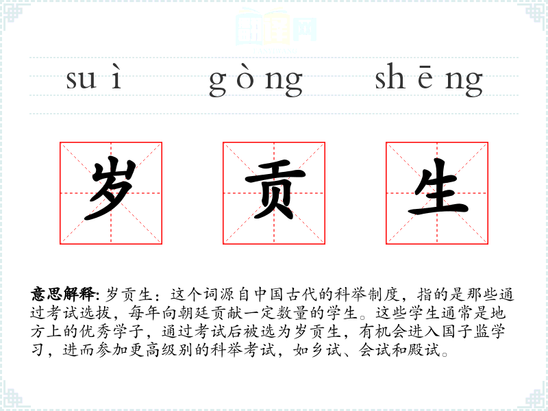 岁贡生:这个词源自*古代的科举制度,指的是那些通过考试选拔,每年向朝廷贡献一定数量的学生。这些学生通常是地方上的优秀学子,通过考试后被选为岁贡生,有机会进入国子监学,进而参加更高级别的科举考试,如乡试、会试和殿试。