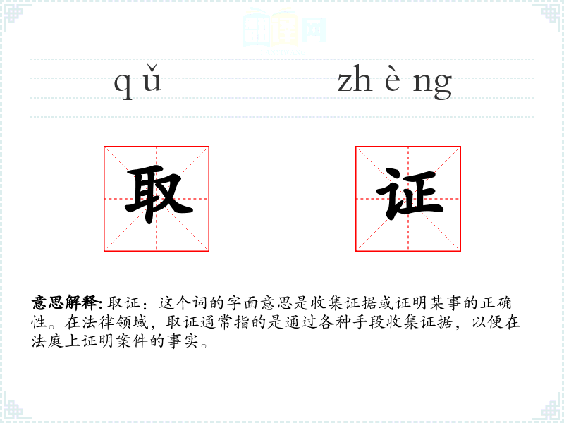 取证:这个词的字面意思是收集证据或证明某事的正确性。在法律领域,取证通常指的是通过各种手段收集证据,以便在法庭上证明案件的事实。