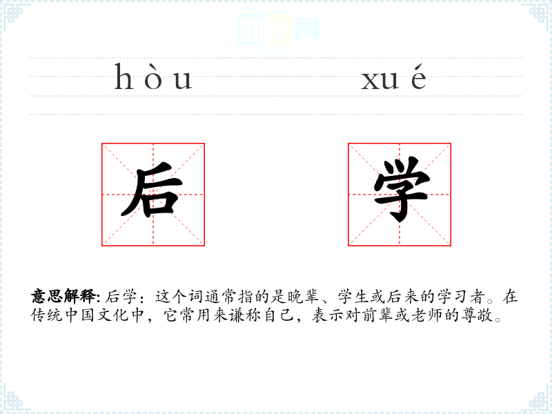 后学:这个词通常指的是晚辈、学生或后来的学*者。在传统**文化中,它常用来谦称自己,表示对前辈或老师的尊敬。