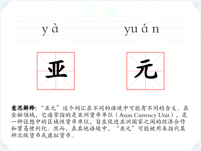 “亚元”一词可能是由“亚洲”和“货币单位”两个词组合而成。随着亚洲经济一体化的讨论和实践,这个词汇逐渐被引入到专业领域中。