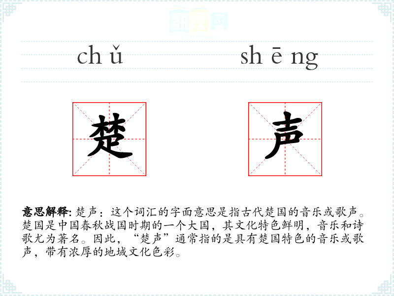 在文化中,楚国以其独特的文化和艺术而闻名,尤其是《楚辞》和楚地的音乐。因此,“楚声”不仅是一个音乐术语,也是楚文化的重要象征,反映了楚国在古代文化中的独特地位。