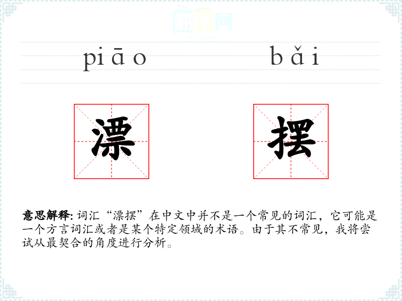 由于“漂摆”不是一个常用词汇,我们对它的理解可能非常有限。在语言学习和表达中,了解和掌握常用词汇更为重要。如果“漂摆”是一个特定领域的术语或方言词汇,那么了解它在那个特定语境中的意义和用法将是有价值的。