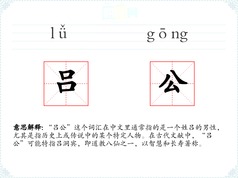 “吕公”这个词汇在中文里通常指的是一个姓吕的男性,尤其是指历史上或传说中的某个特定人物。在古代文献中,“吕公”可能特指吕洞宾,即道教八仙之一,以智慧和长寿著称。