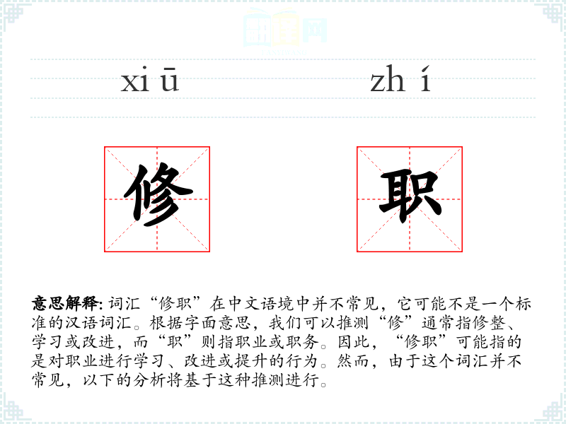 词汇“修职”在中文语境中并不常见,它可能不是一个标准的汉语词汇。根据字面意思,我们可以推测“修”通常指修整、学习或改进,而“职”则指职业或职务。因此,“修职”可能指的是对职业进行学习、改进或提升的行为。然而,由于这个词汇并不常见,以下的分析将基于这种推测进行。