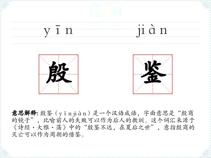 殷鉴(yīn jiàn)是一个汉语成语,字面意思是“殷商的镜子”,比喻前人的失败可以作为后人的教训。这个词汇来源于《诗经·大雅·荡》中的“殷鉴不远,在夏后之世”,意指殷商的灭亡可以作为周朝的借鉴。