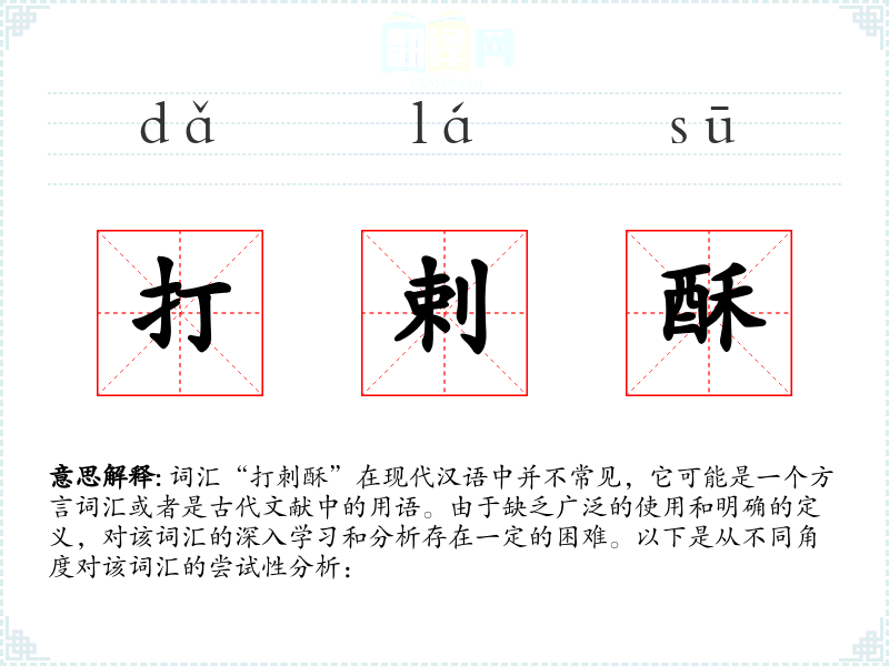 由于“打刺酥”不是一个常用词汇,对其的理解和应用存在较大的不确定性。在语言学习和表达中,可能需要更多的上下文信息来准确理解和使用该词汇。