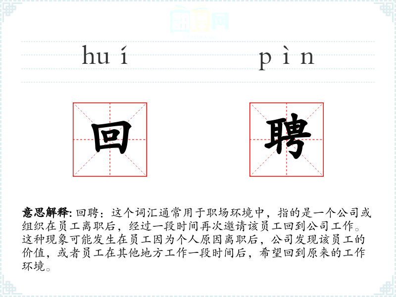 回聘这个词汇是现代汉语中的一个合成词,由“回”和“聘”两个字组成。随着职场环境的变化和人力资源管理的发展,这个词汇逐渐被广泛使用。