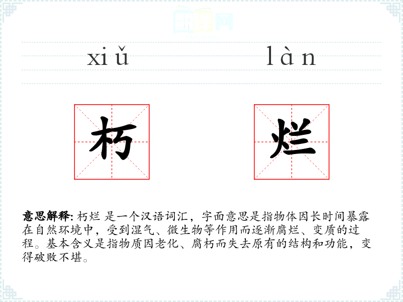朽烂 是一个汉语词汇,字面意思是指物体因长时间暴露在自然环境中,受到湿气、微生物等作用而逐渐腐烂、变质的过程。基本含义是指物质因老化、腐朽而失去原有的结构和功能,变得破败不堪。