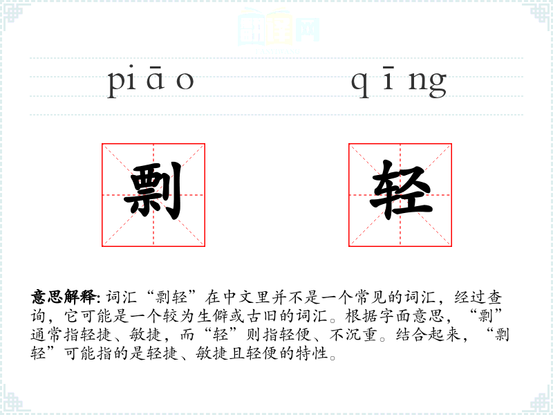 - 理解:剽轻是一个具有古代文学色彩的词汇,用来形容轻捷、敏捷且轻便的特性。