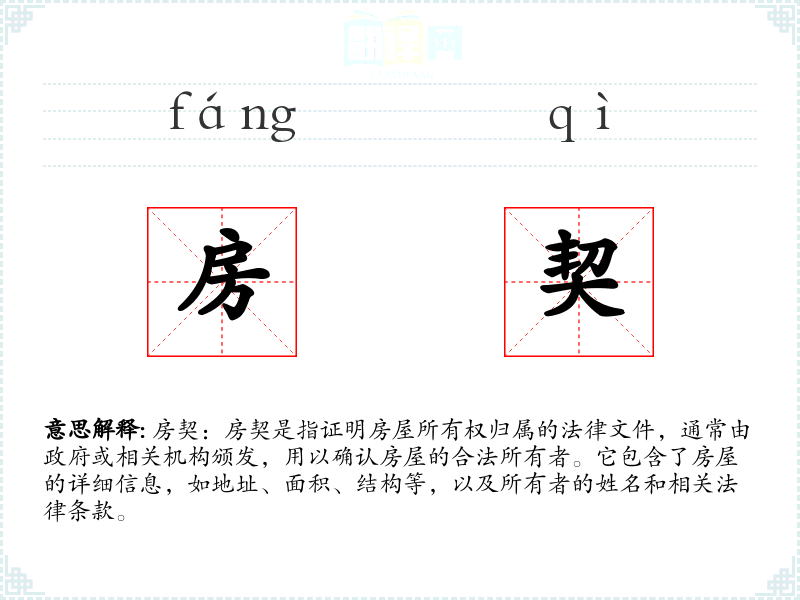 - 反义词:无。房契作为所有权的证明,没有直接的反义词。
