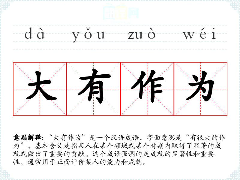 “大有作为”是一个汉语成语,字面意思是“有很大的作为”,基本含义是指某人在某个领域或某个时期内取得了显著的成就或做出了重要的贡献。这个成语强调的是成就的显著性和重要性,通常用于正面评价某人的能力和成就。