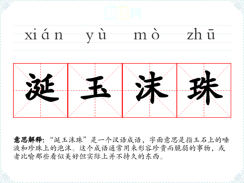 “涎玉沫珠”是一个汉语成语,字面意思是指玉石上的唾液和珍珠上的泡沫。这个成语通常用来形容珍贵而脆弱的事物,或者比喻那些看似美好但实际上并不持久的东西。