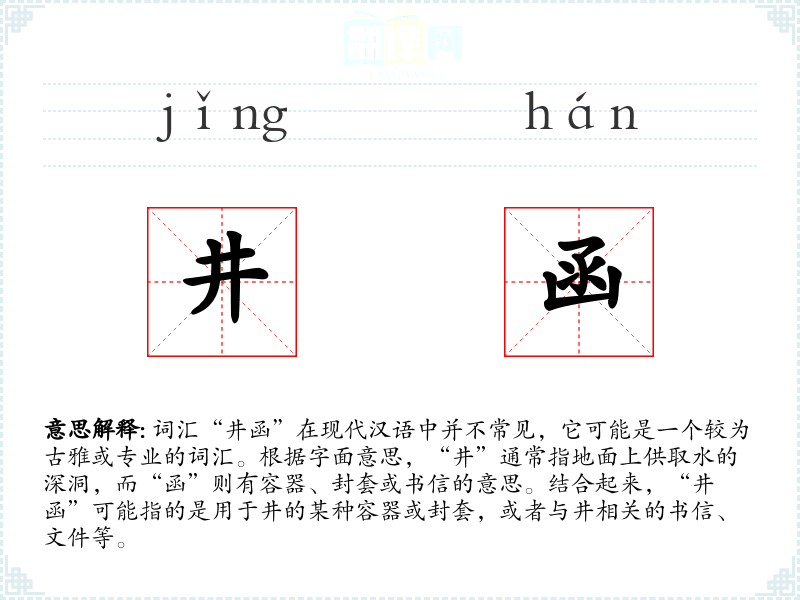 词汇“井函”在现代汉语中并不常见,它可能是一个较为古雅或专业的词汇。根据字面意思,“井”通常指地面上供取水的深洞,而“函”则有容器、封套或书信的意思。结合起来,“井函”可能指的是用于井的某种容器或封套,或者与井相关的书信、文件等。