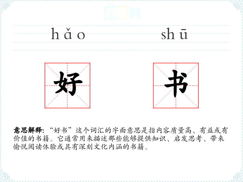“好书”这个词汇的字面意思是指内容质量高、有益或有价值的书籍。它通常用来描述那些能够提供知识、启发思考、带来愉悦阅读体验或具有深刻文化内涵的书籍。
