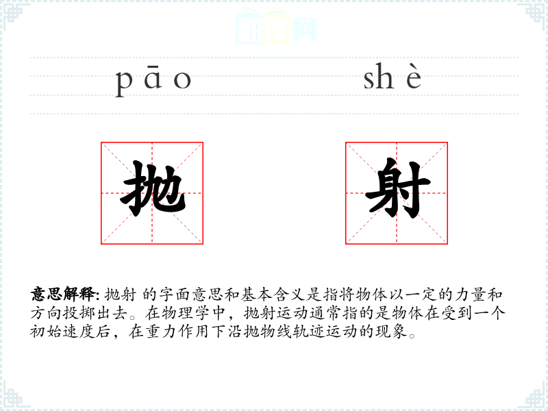 抛射 的字面意思和基本含义是指将物体以一定的力量和方向投掷出去。在物理学中,抛射通常指的是物体在受到一个初始速度后,在重力作用下沿抛物线轨迹的现象。