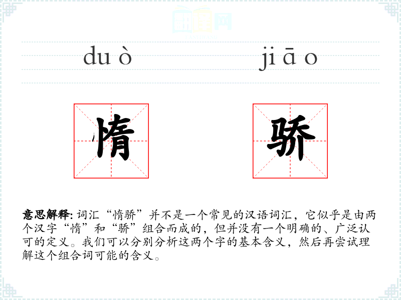 词汇“惰骄”并不是一个常见的汉语词汇,它似乎是由两个汉字“惰”和“骄”组合而成的,但并没有一个明确的、广泛认可的定义。我们可以分别分析这两个字的基本含义,然后再尝试理解这个组合词可能的含义。