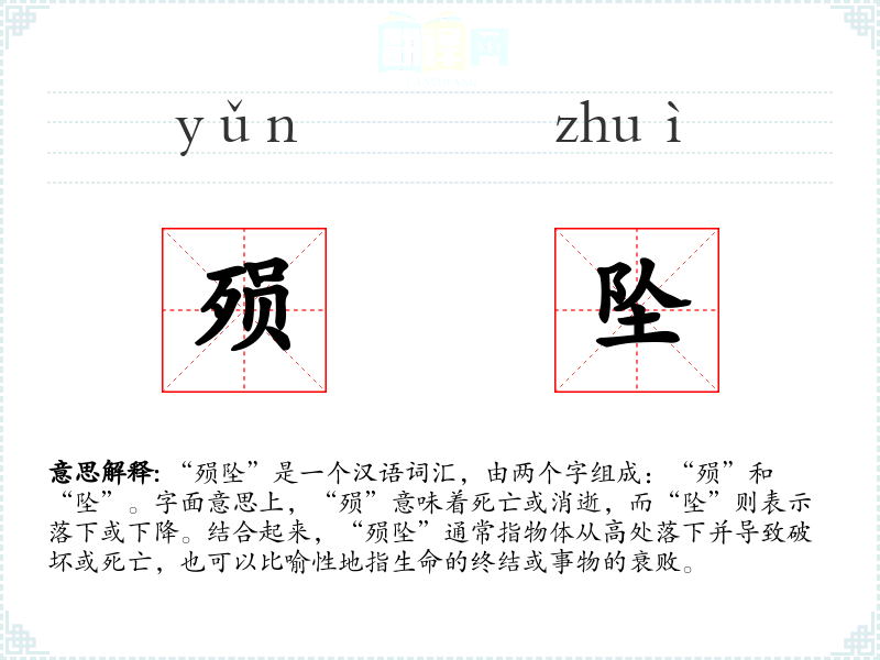 “殒”字最早见于《说文解字》,原意为死亡。“坠”字则较早见于甲骨文,原意为落下。两个字结合使用,形成了“殒坠”这一复合词,主要用于描述悲剧性的下降或终结。