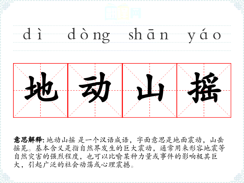 地动山摇 是一个汉语成语,字面意思是地面震动,山岳摇晃。基本含义是指自然界发生的巨大震动,通常用来形容地震等自然灾害的强烈程度,也可以比喻某种力量或**的影响极其巨大,引起广泛的社会动荡或心理震撼。