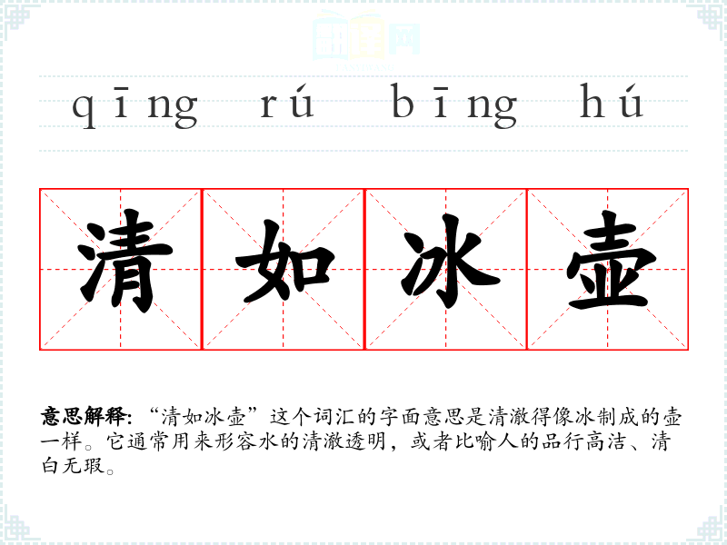 “清如冰壶”这个词汇的词源较为直观,由“清”和“如冰壶”组成。在古代文学中,冰壶常被用来比喻清澈透明的事物,这种用法逐渐演变成形容词短语。